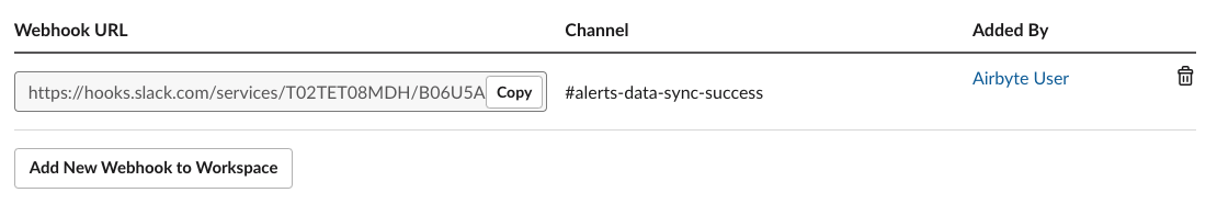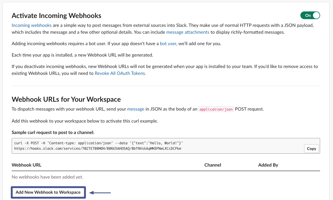 . Click the slider button in the top right to turn the feature on. Then clickAdd New Webhook to Workspace