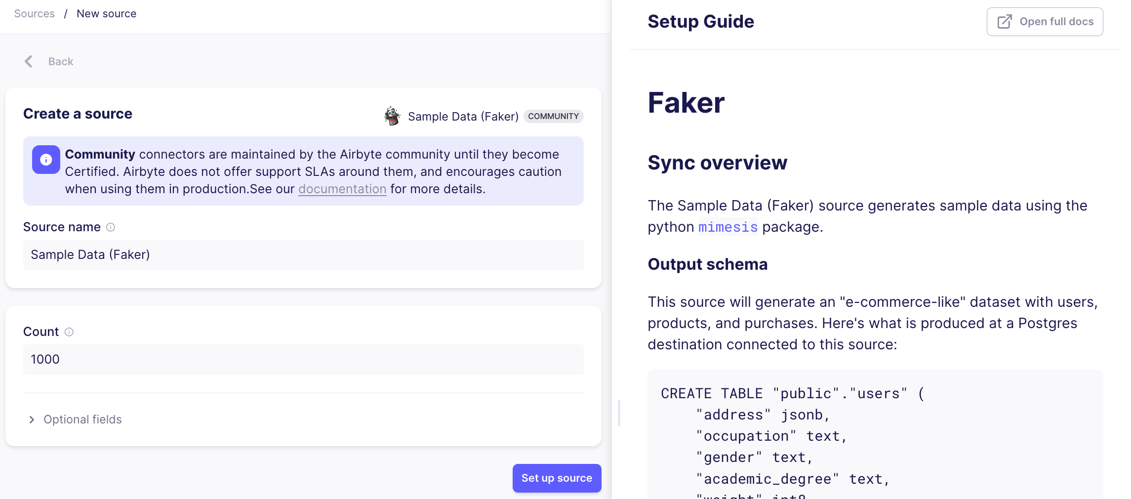 The left half of the page contains a set of fields that you will have to fill out. In the Source name field, you can enter a name of your choosing to help you identify this instance of the connector. By default, this will be set to the name of the source (ie, Sample Data (Faker)